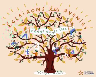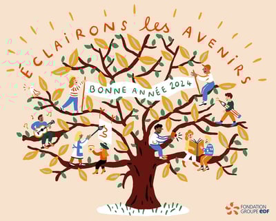 À l’occasion des vœux 2024 de la Fondation groupe EDF, réalisation d’une carte de vœux illustrée par l’artiste Marie Assénat, en collaboration avec l’agence Gad Australie.