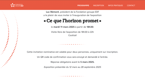 Dans le cadre du vernissage de l’exposition Ce que l’horizon promet de la Fondation groupe EDF, pilotage de la création et de l’éditorialisation d’une plateforme dédiée à la gestion des invitations.